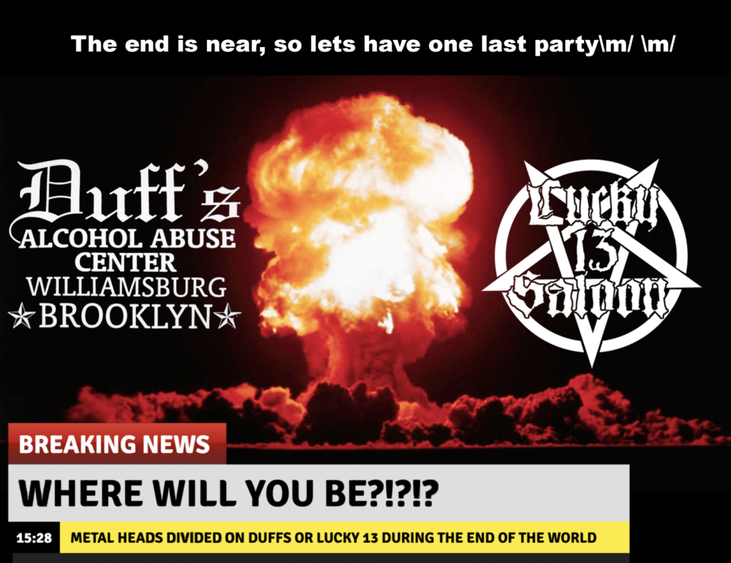 In a time of global pandemics, civil unrest, and the potential for a nuclear war, there is no doubt that the end is possibly near, so with that, I know that this is on the forefront of everyone’s mind. Are we going to Duffs or Lucky 13 for the apocalypse?
