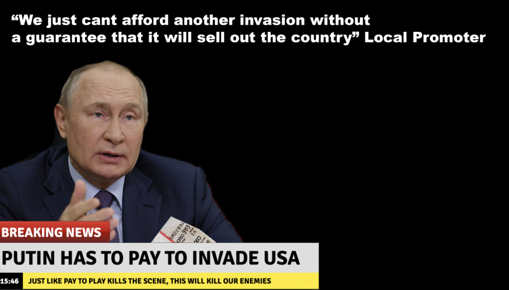 With Putin continuing to escalate tensions, the USA department of defense is using the same tactics promoters use to fend off shitty bands. They are calling it Pay to Invade. With the rouble in the total shitter, Vladimir Putin refuses to set foot on soil that requires armies to pay to invade their country. While Japan was able to get the gig in Pearl Harbor and Al Qaeda was able to perform in New York City (minus the 19 tickets needed), Vladimir Putin does not have the support or popularity to invade the United States and cannot fill the US’s territory.